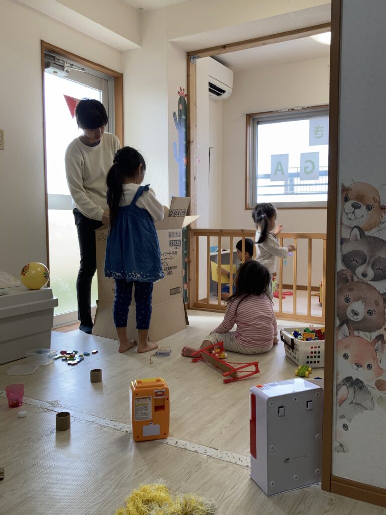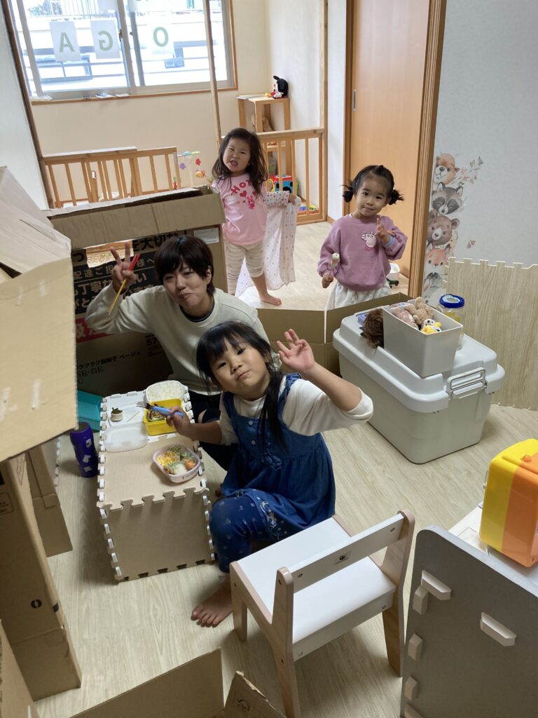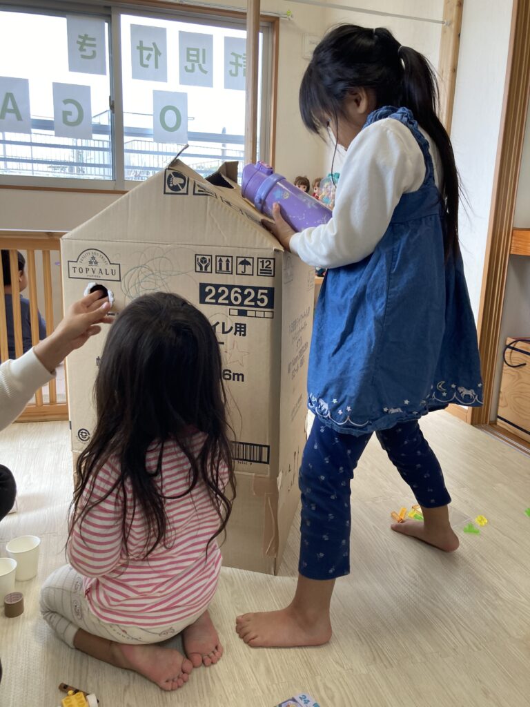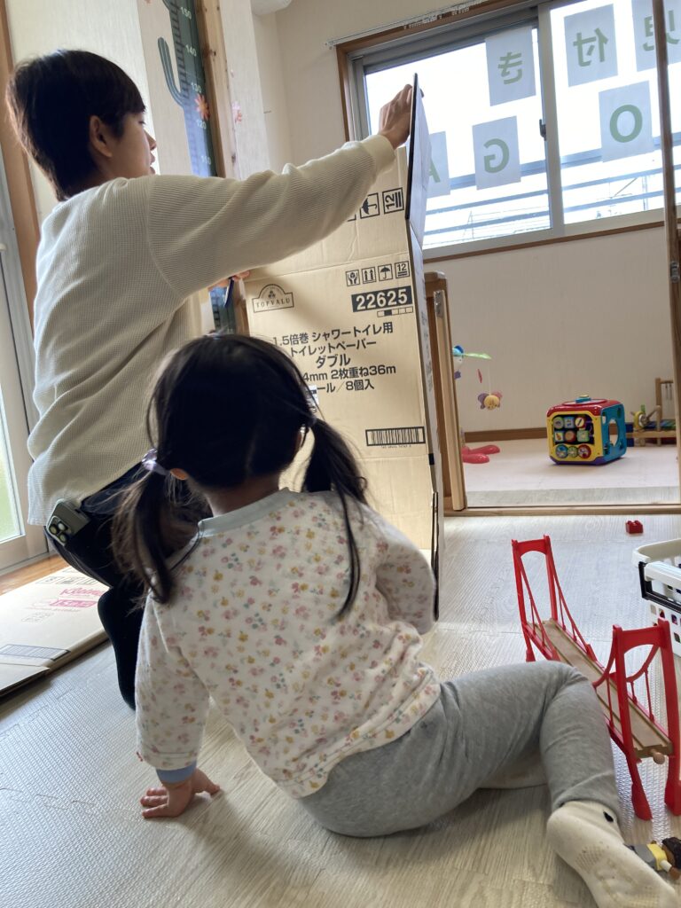 お姉さんたちは更なる段ボールハウスに挑戦。もうここからは保育士は必要なところだけ手を貸す形でなんとかやっていけます。楽しくて楽しくて時間があっという間だね。