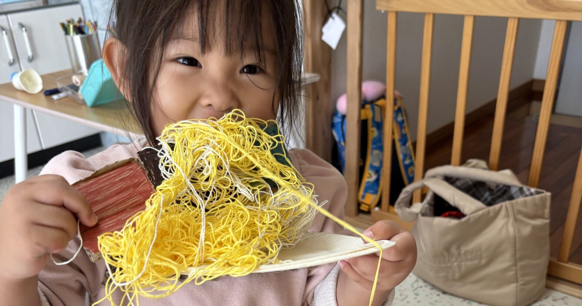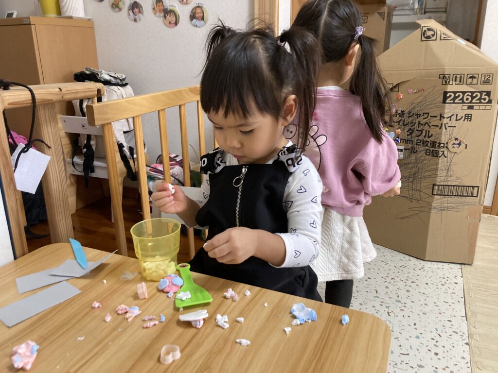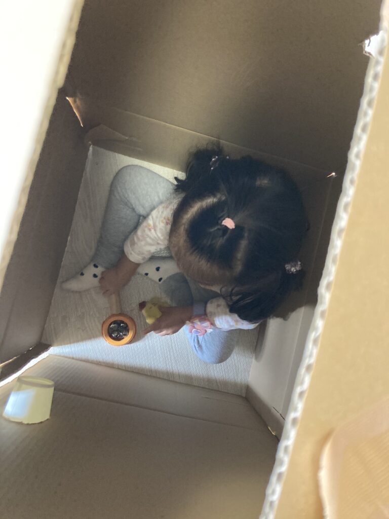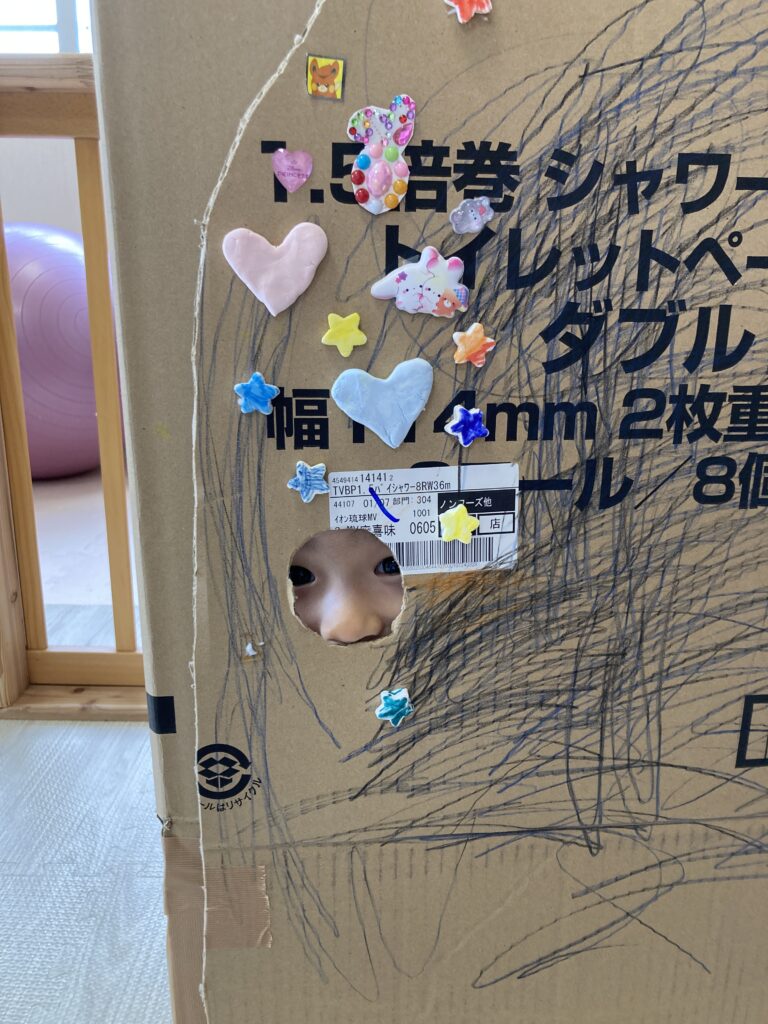 お姉さんたちは更なる段ボールハウスに挑戦。もうここからは保育士は必要なところだけ手を貸す形でなんとかやっていけます。楽しくて楽しくて時間があっという間だね。