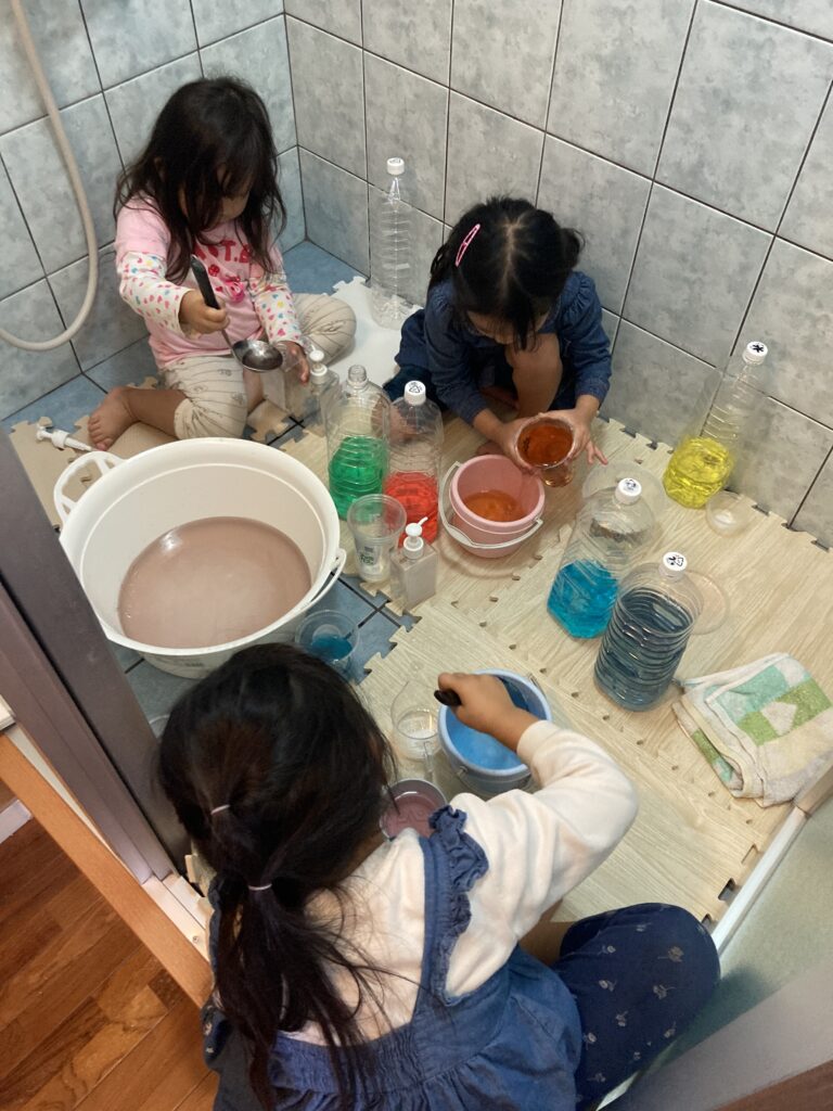 ちょおっと狭いけど、みんなで譲り合いながら色水遊びしました🚿
