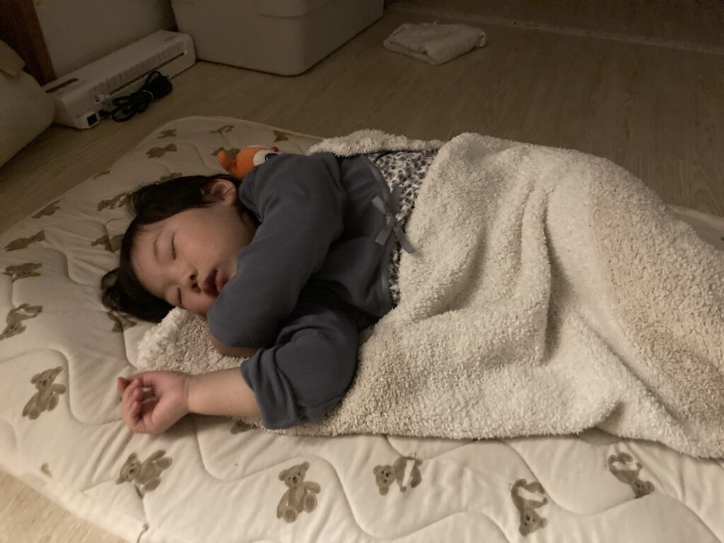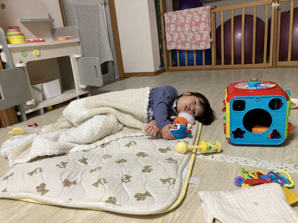パパママと離れてしまう寂しさもあり、しばらく涙が出た後、安心できてきたのか抱っこですやすやと眠りにつきました。