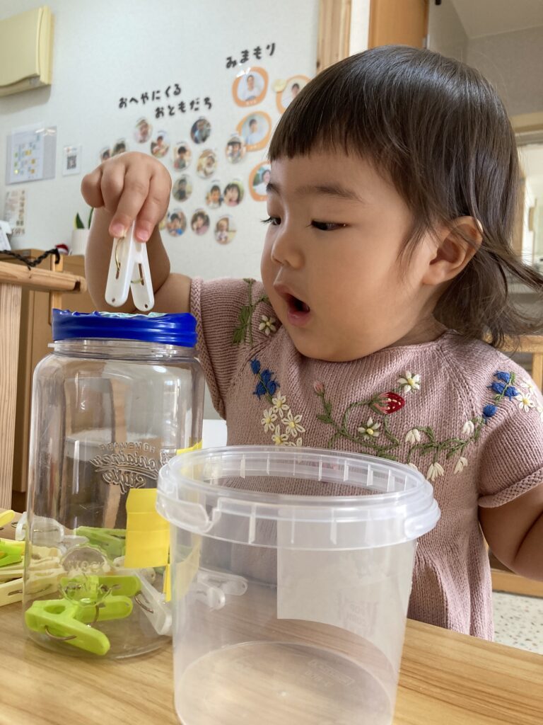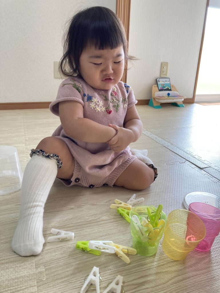 1歳を超えたあたりからお気に入りの洗濯ばさみの洗濯ばさみのぽっとん落とし。