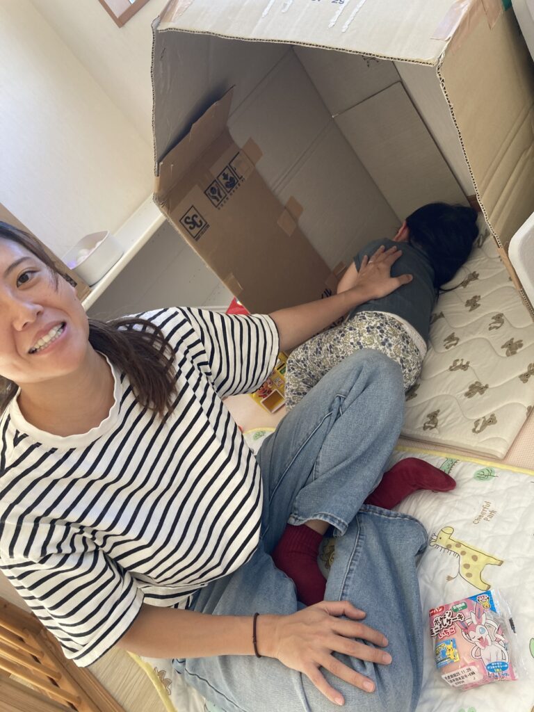 土曜日にお姉ちゃんたちが作ったダンボールハウスベッドにゴロン☺️