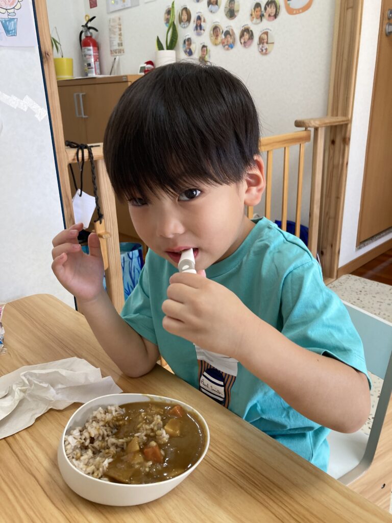 お兄ちゃんはお昼ご飯タイム。ステラガーデンには電子レンジがあるのでレトルトをお持ちになる方も多いです🍛